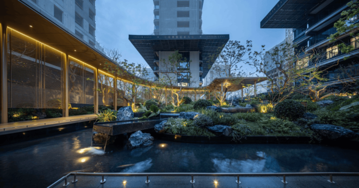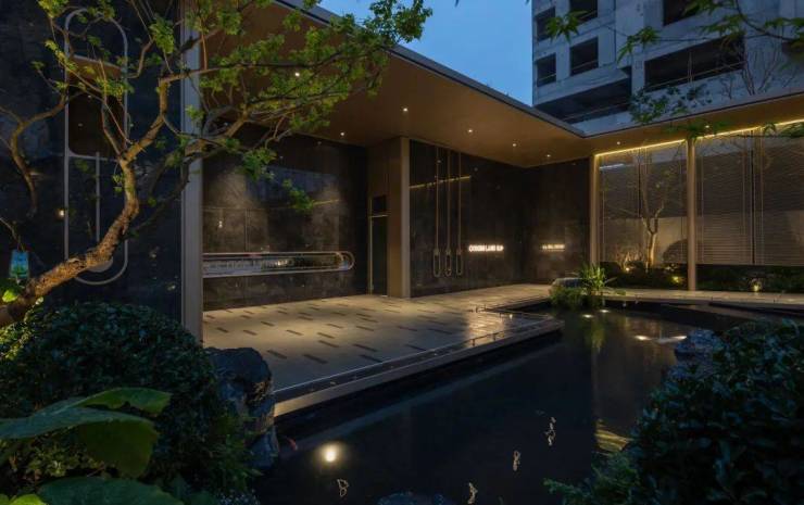 沿着人行入口就进入了奢装水系园林,大面星耀灰石材铺装,奢侈用材打造景墙,归家奢华感爆棚;