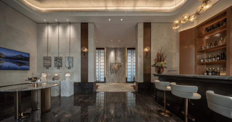 入户大堂一侧是全封闭的行政酒廊与洽谈区,罕见的莫兰迪色石材打底,复古且优雅;未来,业主可以在这里,邀好友两三,或看书赏景,享精致社区的岁月静好。(备注:基于第三方运营等客观因素,项目底商、有氧健身中心、恒温泳池、行政酒廊等经营场景的经营、开放等存在较多不确定性,具体以实际为准。)