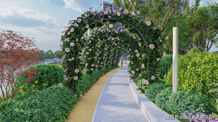 滨水而居的社区景观,融入艺术廊架、中央花园、健康跑道、日光草坪、星球主题全龄段儿童乐园等功能场地,为居者的日常增添乐趣。