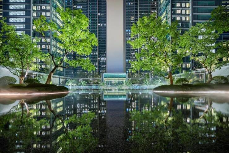 步入园区主入口,大门檐口轻薄而舒展,整个主入口抬高三至四米,带来极具通透的视野之余,也筑起高阶仪式感的归家享受。