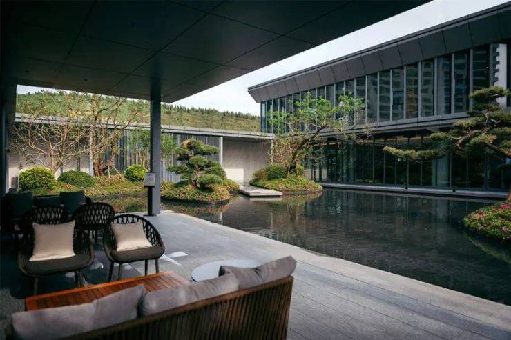 镜面水景倒映着仪式绿岛、迎客松,结合四季变化的植物设计的涌泉、雾森系统,将整个归家氛围烘托的格外轻松自在。