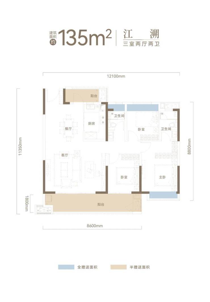 高比例阳台赠送,客厅、主卧、次卧、阳台全飘窗赠送,再加上一东一西两个超大阳台面积半赠送,超高比例赠送,全屋空间使用率达95%。