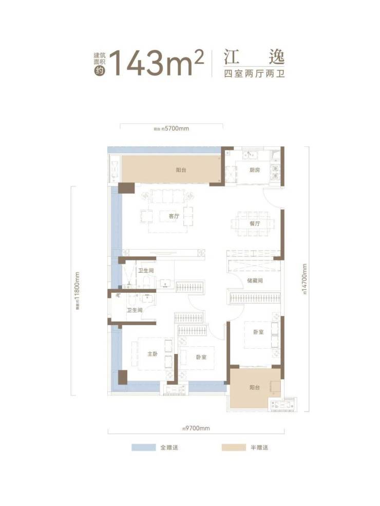 建面约143㎡户型,270°采光U型观江+高比例阳台赠送+“3+1”格局动静分区+约30㎡主卧套房。