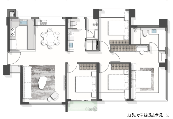 127㎡户型岛内实用率达到88%,全屋赠送8个飘窗,室内各个空间尺度都很舒适,餐厅可以放得下圆桌,次卧面宽均达3米,都能放得下舒适大床。