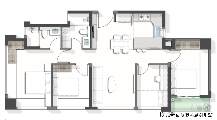 比如【幸福厨房】——采用更大过道、更宽台面与半开放式岛台,增大厨房和餐客厅的互动性,也增大了厨房的操作空间,节省了后期业主改造成本。
