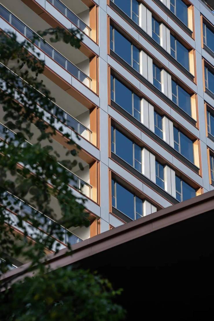 细节上,呈现出独具一格的丰富层次,阳台3层暖色金属边框,好像“三眼皮”层层递进,增强了建筑的立体感和层次感。