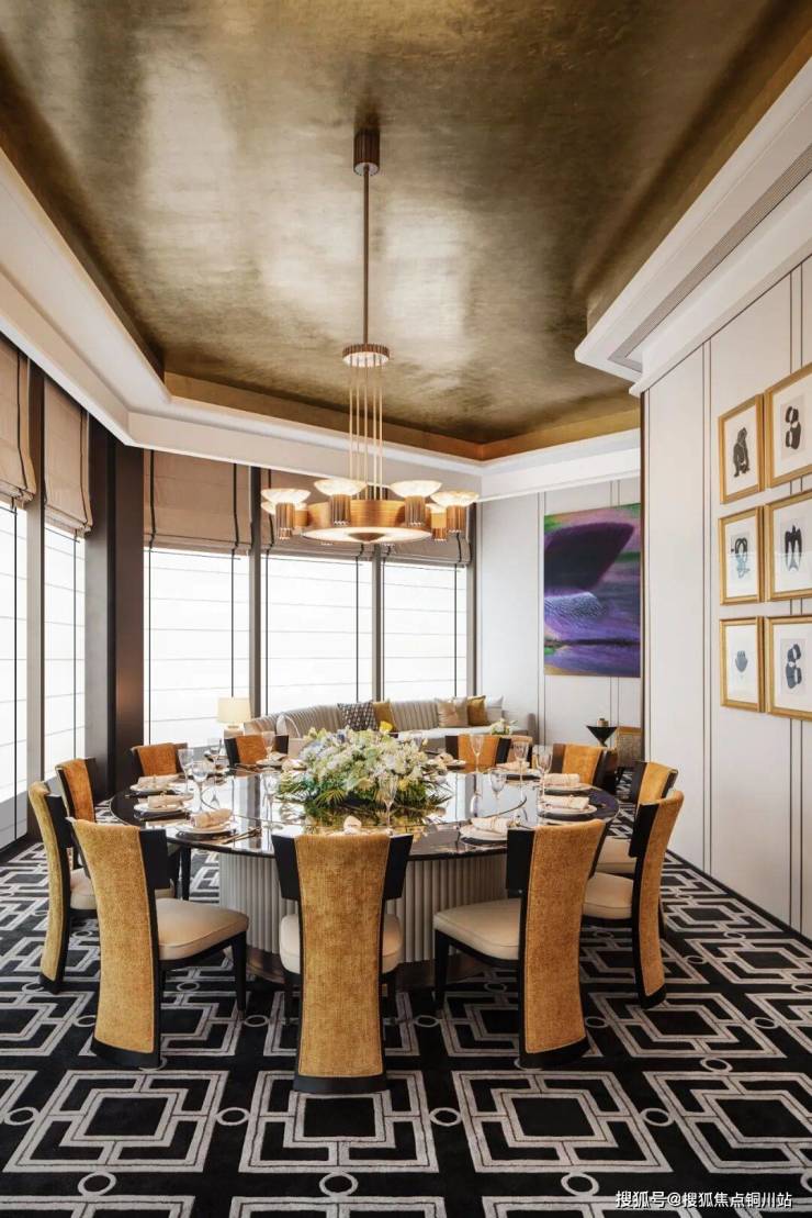 260户型将艺术法式的精致与现代风格的简约流畅巧妙结合,形成了一种新颖而独特的美学表达,每一处空间都流淌着艺术的气韵,不仅体现了对生活的深沉热爱,更彰显了对美的无限向往和追求。客餐厅位于中央区域,与开放式厨房相连,形成一个开放流畅的生活空间。 客餐厅与书房功能整合,既保留宁静的阅读工作环境,实现空间灵活运用,让家庭生活与艺术韵味并存。深色木饰面墙面、金属腰线装饰及蓝金沙奢石背景墙的大面积应用,使空间更精致富有艺术气息。同时采用对称设计,弧形凹龛与层板吊架结合,增强艺术感,提升实用性。