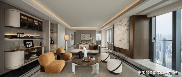 220户型参考酒店式公寓的设计,风格简约而注重细节。幕墙边采用镜面材质以延展景观视野,主背景墙选用白色奢石,地面铺陈浅色天然大理石。墙面搭配烤漆框线与浅色条纹壁布,餐厅辅以胡桃木框线与深色西装面料壁布,并设置镜面迷你吧。窗边设计休闲区域,搭配米色系软装,局部深蓝色单品点缀与硬装相辅相成。