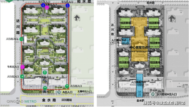项目竖向设计的最大突破点在于半地下空间的极致利用,除利用原始地形高差设置半地下车库拉平住区地平外,南侧商业与地铁站点结合打造半地下集散休闲广场,形成立体复合的城市空间形态。沿汉川路场地适当抬高,北侧沿路进行台地式景观处理化解道路高差压力,塑造良好的城市形象与灵动的空间关系。
