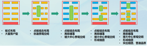 破局的第一步就是在密度较高的地块内满足开发强度,通过多轮布局形式比选,设计很快确定“围合形态”的基本布局框架,围合中心设置大尺度中央景观院落空间;第二要做到“点板结合”,结合居住产品定位,通过面宽及位置变化打造疏密有致的区内空间,顺延城市道路由南向北依次展开低层TOD商业内街及16层至25层点板塔楼,勾勒出整个城市社区的整体空间状态,打造出高低错落的立体城市院子。