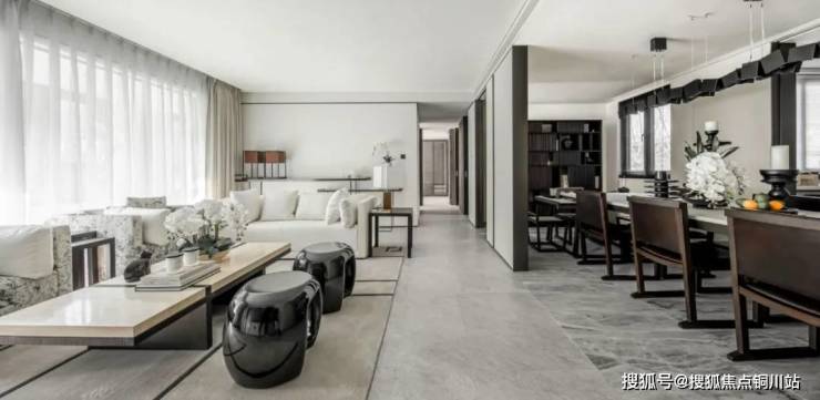 阳光草坪、搭配高约11米的朴树,加上水景,坐在会客厅的沙发上,仿佛在度假。