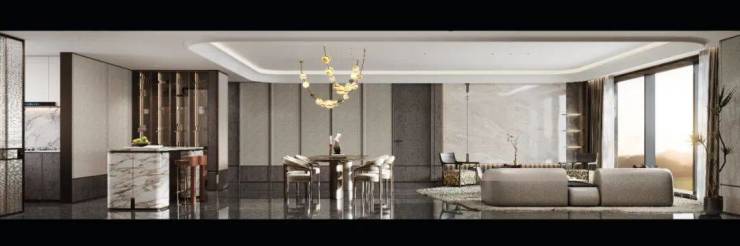Ultra版环幕客厅,面向江景与中庭处,采用无界转角270度全景舱设计,拥有极致景观视野。