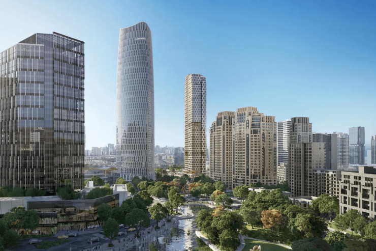项目的建筑立面是非常有辨识度的,整体采用“鎏金冠冕”公建化设计,造型灵感来源于黄鹤楼的飞檐和长江的风帆。