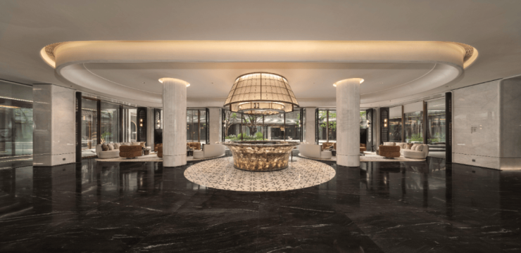 前厅为酒店式落客设计,运用大量奢石;四水归堂的黑石水景以法国进口宝格丽奢石铺就。
