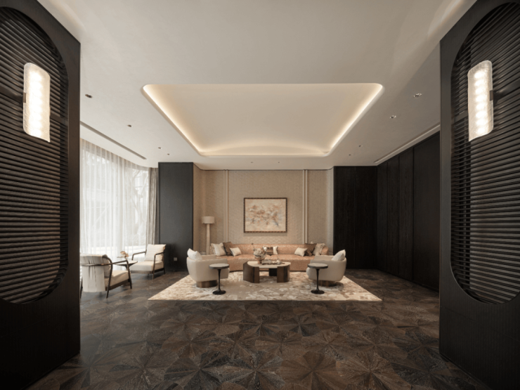 约1000㎡泛会所利用楼栋架空层打造开放式邻里空间。设置有“老钱风”的家庭娱乐休闲吧、行政酒廊、家庭艺术会客厅等,平衡商务与休闲。