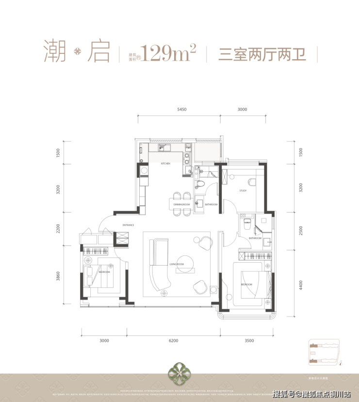 建面约 129㎡三室两厅两卫,套内实得面积约 106.5㎡,实际出房率约 83%。约 11.6 米纵向进深,约3.5 米面宽主卧套房 , 勾勒从容栖居日常。