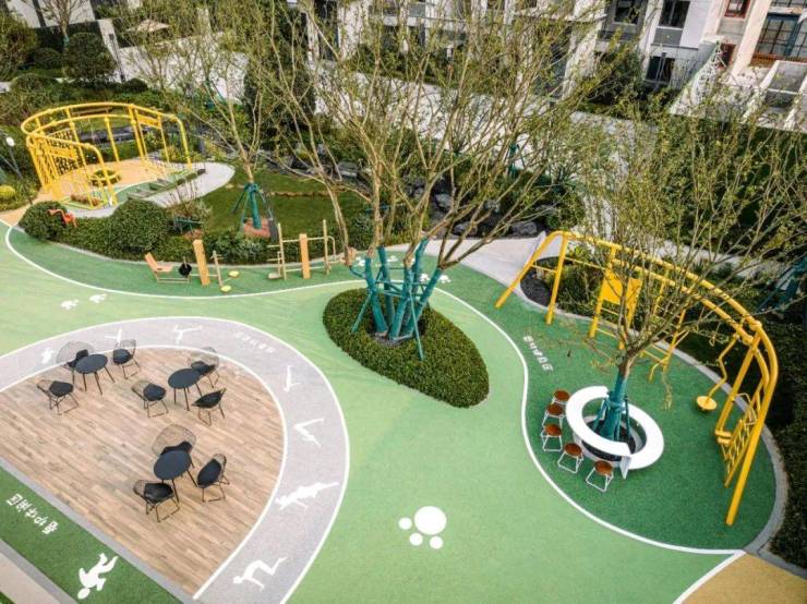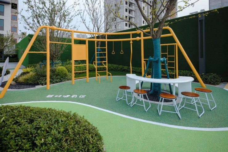 社区中不可忽略的,还有许多人性化的设计细节。例如大树下的高低亲子座椅,安全共乐的双人滑梯、摇篮秋千,舒适亲人的看护桌椅,为孩子们提供无忧玩耍的欢乐场所,也让关怀无微不至。