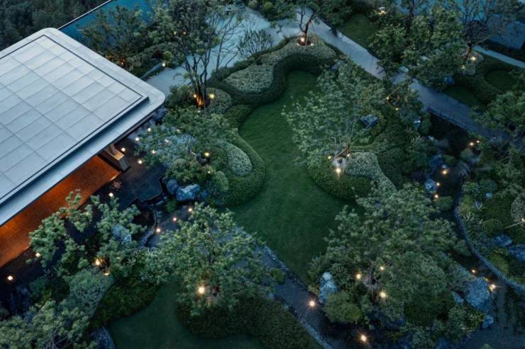 两轴(中央礼宾轴、山水游园轴)串联七巷(玉树、金实等叠墅景观巷),步移景异间,既有“疏影-壁”的雅趣,亦有“清逸-径”的悠然,将“隐逸东方”的造园哲思落于一草一木。
