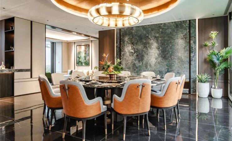 比如私宴会客厅,将餐厅、厨房、水吧、茶台等统统配齐,且餐厅背景墙采用的都是整面岩板,商务宴请时格调拉满!