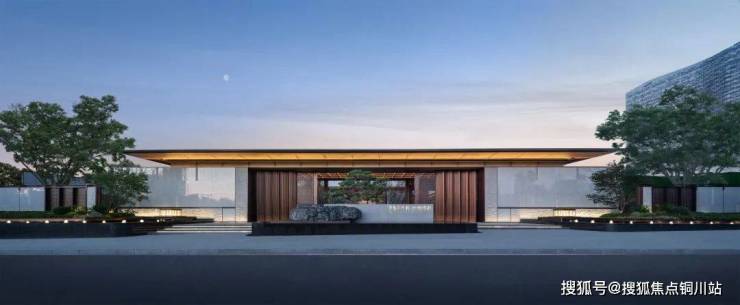 项目主大门充分展现了景观场所的强场域感,跨度约46米,高度约6米,尽显恢弘大气。选材上,蓝眼睛蘑菇面石材+灰色瓷板+金属材质的搭配,衬托出低调奢华的气质。