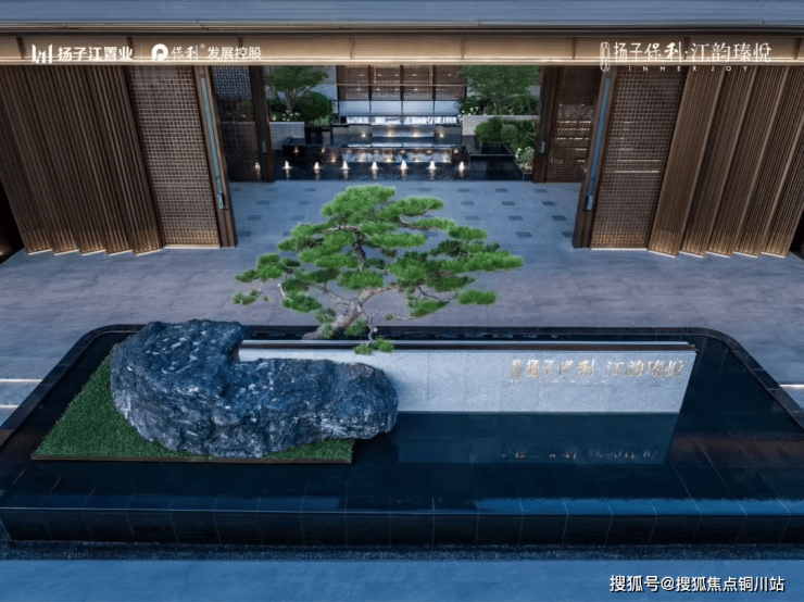 照映造景“一松一石两朴”设计上,酒店式落客前场(迎客黑松+中国黑山石+朴树),寥寥几笔勾勒出一幅雅致的禅意画卷,再配合镜面水景的设计和项目LOGO,共同营造出豪华酒店式归家体验。