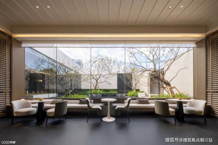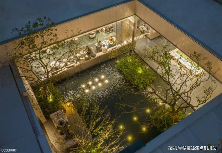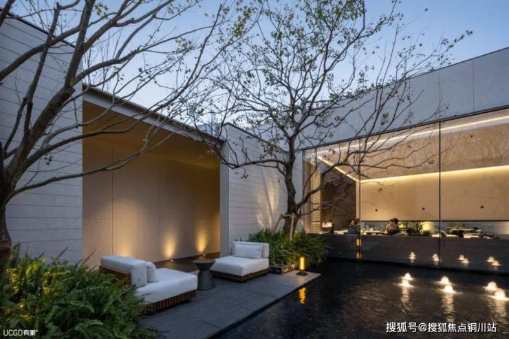第三个庭院,游园视线聚焦在这四方天井之中,结合大面积玻璃幕墙,让建筑与自然的界限消解,创造出度假的静谧氛围。
