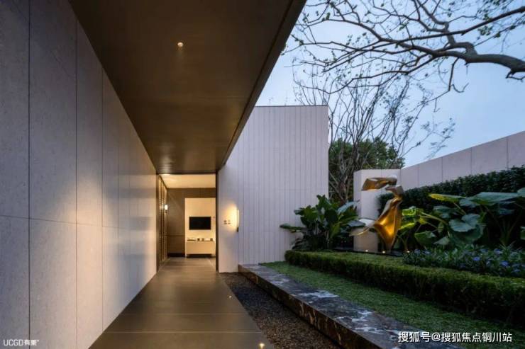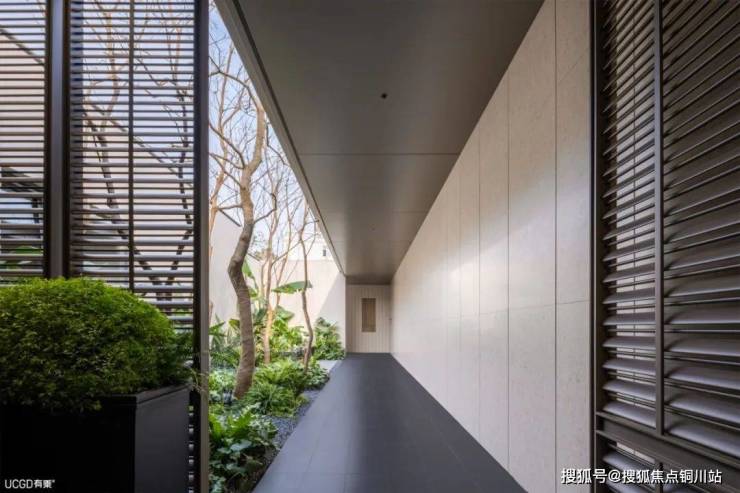 最后一个廊道小院抛开了厚重与复杂的设计,璞拾胥江延续“拾系”作品的白加金色调,融合自然的绿色和天光,打造出简洁又不失美感的建筑空间。 一条绿荫长廊,营造曲径通幽之效。公共与私密相连,直达样板间区域。