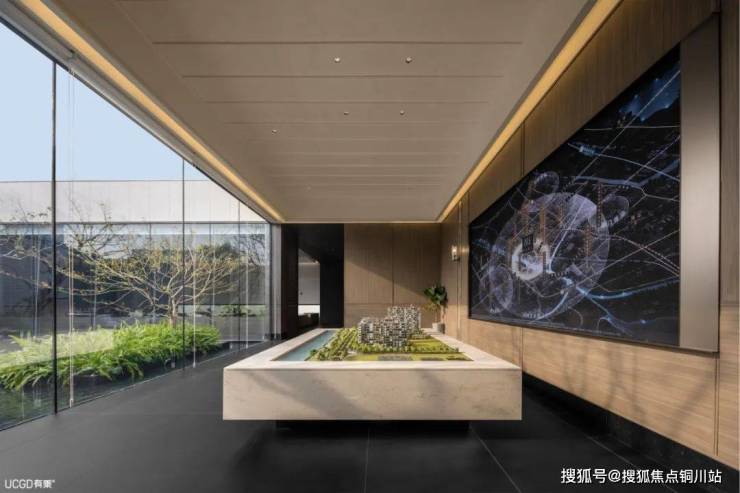 沙盘区和洽谈区转折设置,给小型林园空间的置入提供了可能。水、林与大面积通透的落地玻璃相映,打破室内外的明确界限。人们或行走或落座,或深入其境,都如至假期,惬意放松。