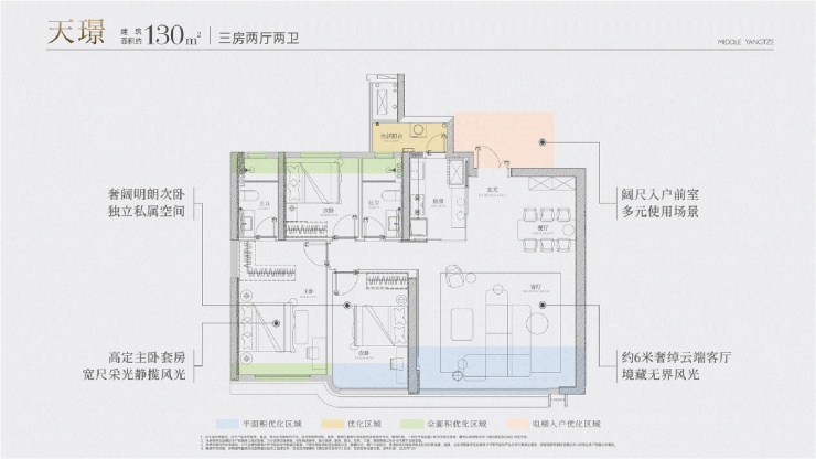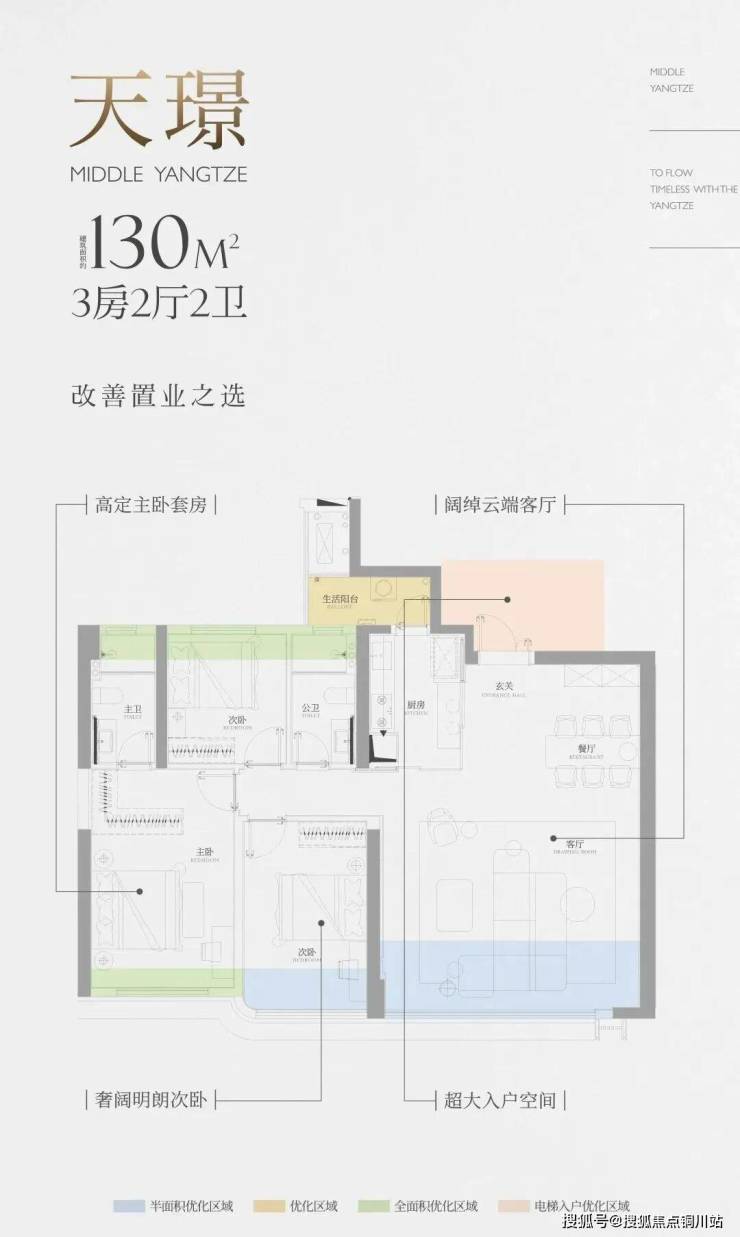 170㎡王牌户型,独梯入户,270°观景主卧套房与约8.5米宽环幕客厅;180㎡户型,270°观江横厅,约28.5米连续看江界面,双套房设计适合二胎家庭或三代同堂。