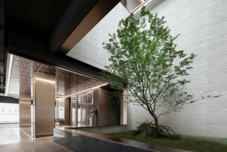 传统项目的入户大堂大都是首层挑高,华曦府主动牺牲可售面积,进一步打造双层挑高大堂,创造更大的尺度空间。
