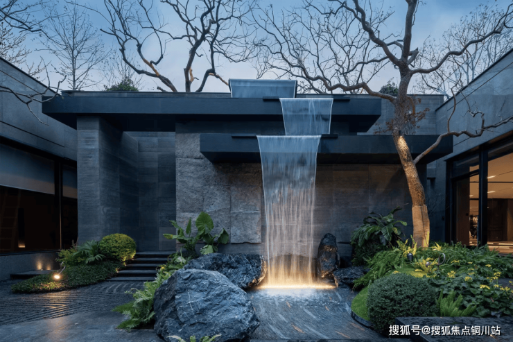 入门是三层叠瀑式景观,飞瀑直下流水万千;合光庭院、艺术长廊,在约1000㎡的镜面水景映照之下,浮光掠影,极富艺术格调。