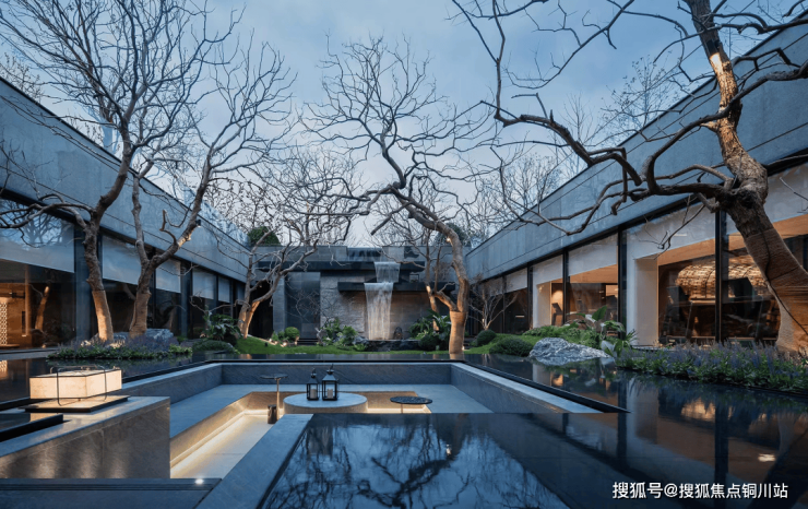 中央聚场结合美国建筑大师路易斯康落日广场的设计语言,四水归堂,水流静邃,8棵榉树矩阵,以中西式结合的设计手法,既显大气,更显格调。
