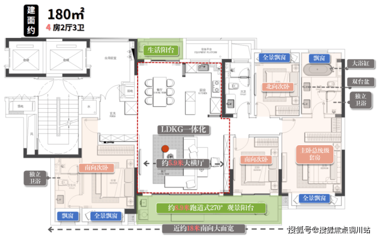 建面约180㎡户型,看尺寸就让人感到奢阔:近约18米的南向大面宽、近约9米的转角阳台、LDKG一体超级巨厅、还有2大套房.....