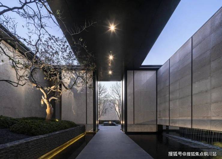 迎宾水院采用东湖石干挂工艺,模拟山水形意打造叠瀑式水景,飞瀑直下,营造高山流水人文意境,开门见水也代表灵气与聚财之意。