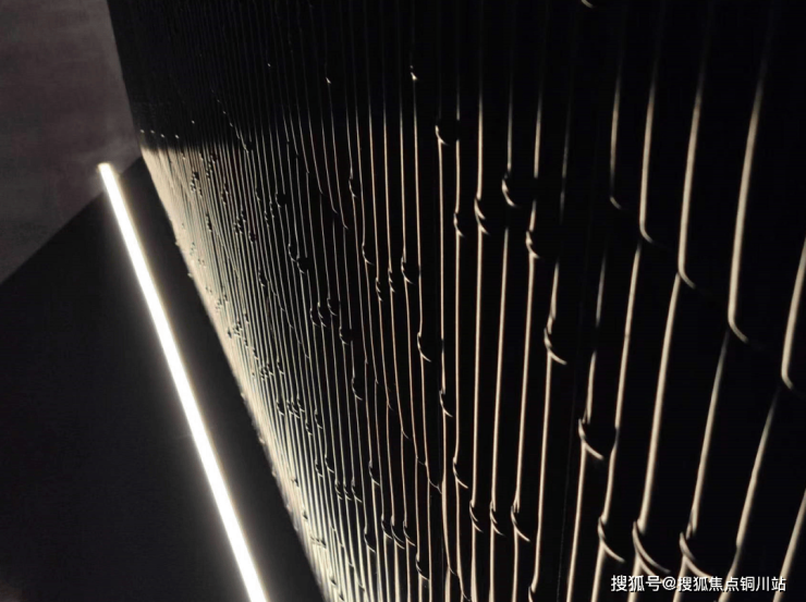 如果说室外是诗情画意的山水之情,进入室内,画风又给人一种历史文化感。格栅造型、窑文化、纯岩板等诸多细节,让人感到一股尊贵的地位感。