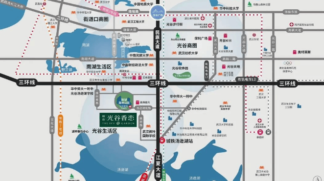 交通配套:拥有四路三轨一隧道立体交通路网,“四路” 即三环、民族大道、关山大道、光谷大道;“三轨” 为有轨电车 L2、城铁汤逊湖站、9 号线(规划中);“一隧道” 指两湖隧道,可快速接驳光谷中心、武昌中心。
