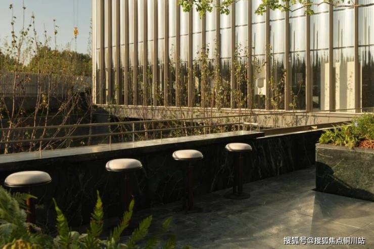 提取建筑形式语言-精制45°斜角设计融入空间中;极致简约的体块关系设计,通过纯粹的几何形态、有序的排列、虚实对比,与前方灰绿色调的植物融合,形成简洁、现代且富有艺术感的视觉效果;