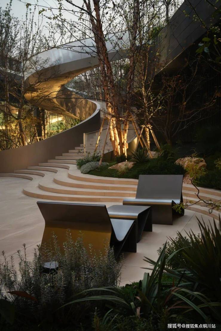 瑞士户外家具品牌Garden系列的Sponeck椅子,Sponeck脚凳;富有张力的不规则环状形态,为空间增添高级质感与松弛感;白桦林勾勒出轻盈的天际线,下层花镜适当留白,为未来可能性预留生长的空间;