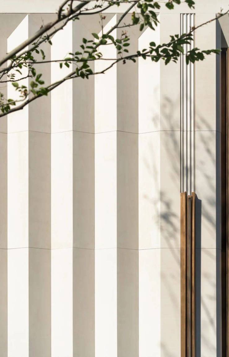 归家大门的两侧景墙摒弃了传统平直设计,采用钻石切面造型,通过多维度的几何切割与材质拼接,形成类似钻石折射的立体光影效果。灵感来源于武汉长江的粼粼波光,又借鉴了现代建筑中对光线的解构手法。