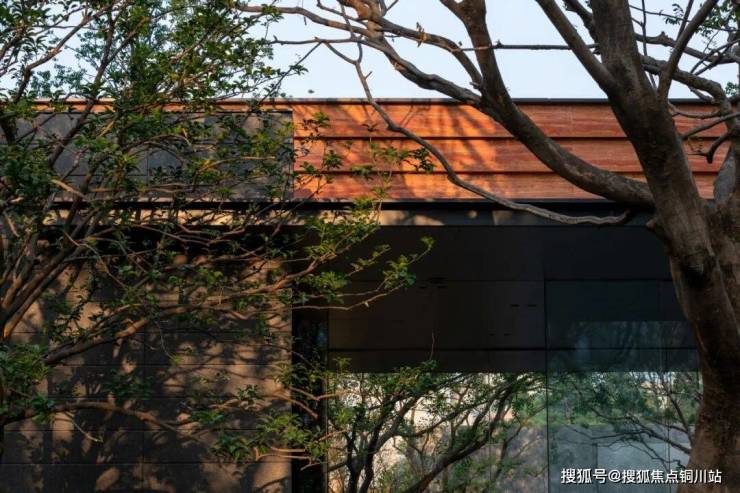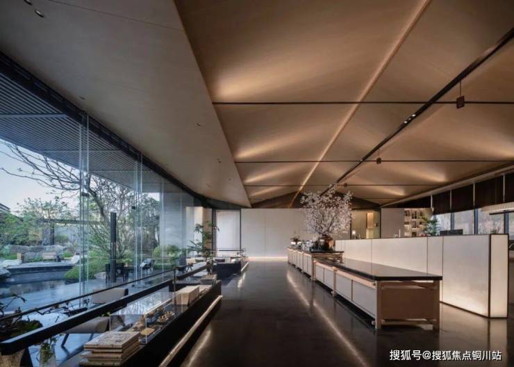 售楼处实现了两面望景的开放状态,两侧各设围合与半围合形式的小乌桕林院,线性弯曲的乌桕树打破了实感的盒子空间,映现出虚实相生、静谧安宁之境。