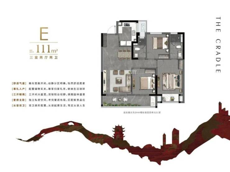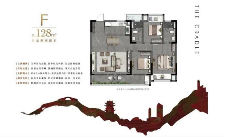建面约128㎡户型是项目的主力户型,设计为3房2厅2卫,四开间朝南,南向约8.7米大阳台。户型方正,布局合理,得房率超76%(不含赠送),整体空间尺度和配置在无锡市场上极为稀缺。