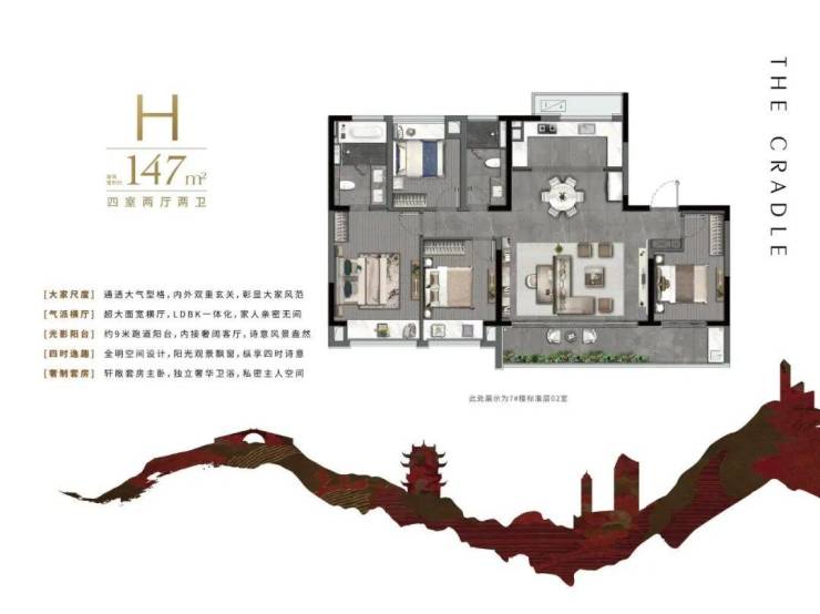 气派餐客厅一体化设计,整个户型宽15.6米、进深约10米,采用飞机户型布局,得房率与利用率极高!另外超大尺度横厅联通约9米超大阔景阳台,方寸之间设计感与尊崇感尽显。这里可以轻松实现多场景交换。