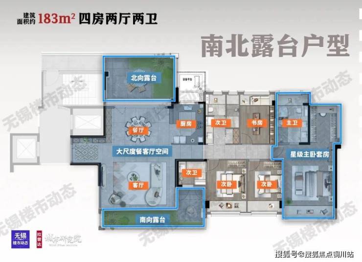 我们再来看建面约183㎡四房两厅三卫,南北双露台户型。