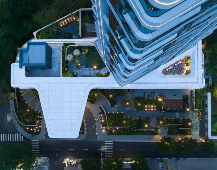 V 字门头与商业街:项目拥有宽约 26 米、高约 9 米的双曲面设计独特 V 字门头,气势恢宏而华丽,成为汉口豪宅的标志性符号。右侧百米长的度假风商业街,引入 GREEN SHOP 品牌店,20 多种绿植花卉与高大乌桕相互穿插,营造出隐奢的口袋花园,让业主回家的路成为一场惬意的 citywalk。