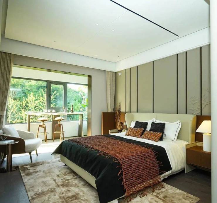 墅居的尊崇,藏于细节的考究。上下双主卧设计,兼顾代际隐私与家庭互动:上层主卧俯瞰山水画卷,下层主卧静享沉静时光。每一处空间,都是为"幽赏清吟"而设的精神领地,或于书房挥毫泼墨,或在阳台邀月对酌,生活的序幕,自此叠境而启。