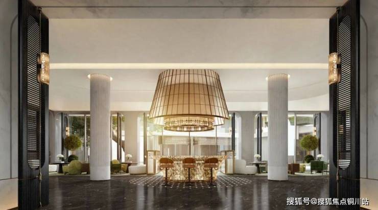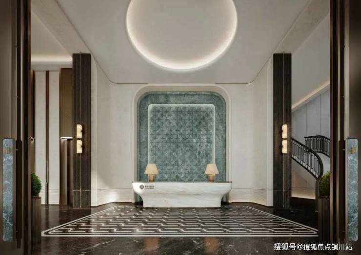 门楼高5.4米双层挑高大堂,396片阿根廷绿雕花叶片拼接出99朵花瓣背景墙,营造尊贵的归家仪式感。通过电梯往下走,来到中央车站,走出电梯厅映入眼帘的是圆形采光天幕,主背景墙面168块达芬奇米黄浮雕,由玉石、金属层叠组成,发出暗暗荧光。本项目将弧线用到极致,处处尽显柔和之美。