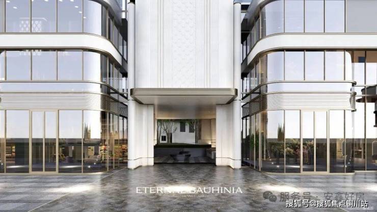 项目引用全球高奢酒店设计灵感,打造约70m恢弘隐奢门庭,立面采用全精工弧形玻璃设计,通过玻璃幕墙的“高透低反”特性,最大化景观视野,将天空、园林、都市的繁华光影,映射于建筑表面。