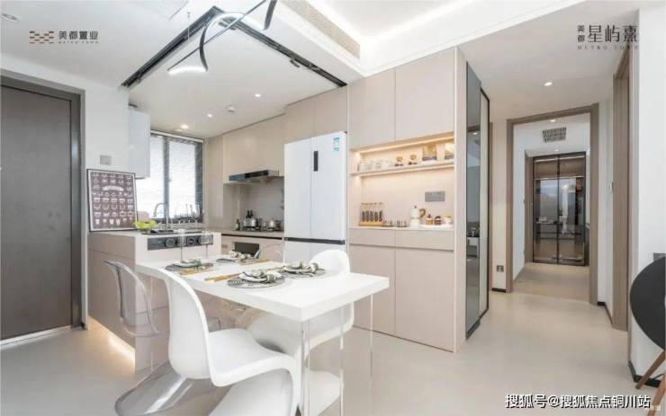 ①开放式厨房+岛台。该户型做了餐客厅一体化设计,更重要的,是开放性厨房,直接增加了整个公区的空间感,做饭时也能和客厅的家人、小孩互动,增进感情。