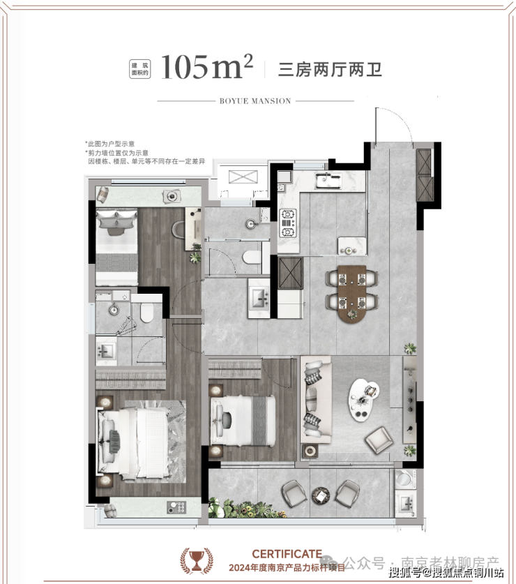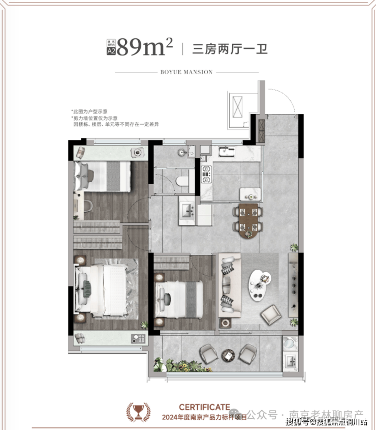 此次加推的的洋房户型为89m²和105m² ,仅有32席,89户型的爆款户型 ,总价更是给了年轻人一个安家南京主城的机会。【主力户型】🏠博悦A2*约89㎡三室两厅一卫