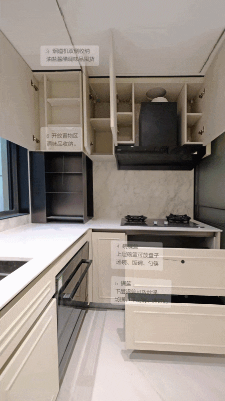 通过水槽侧翻柜巧妙隐藏清洁用具,利用烟道洞洞板实现铲勺调料垂直收纳,将每一寸空间利用到极致。